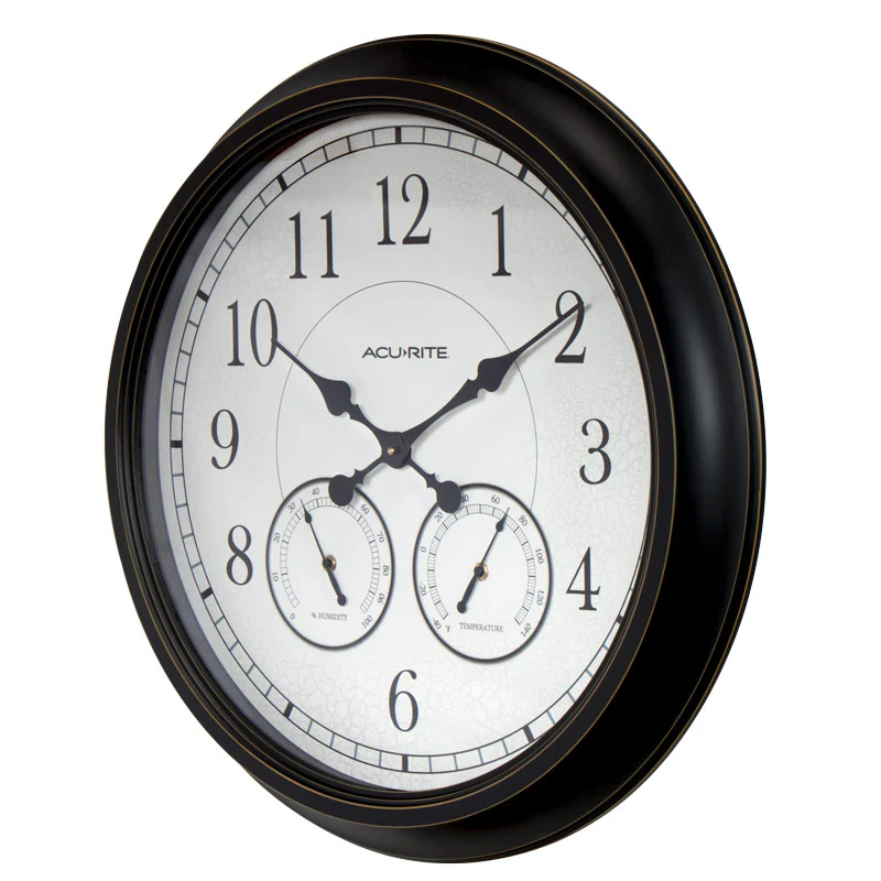 The AcuRite 24-inch Weathered Black Wall Clock with Thermometer and Hygrometer features built-in temperature and humidity gauges that allow you to check comfort conditions at a glance. Durable weather-resistant housing makes this clock combination the perfect accent for indoor or outdoor decorating.Â