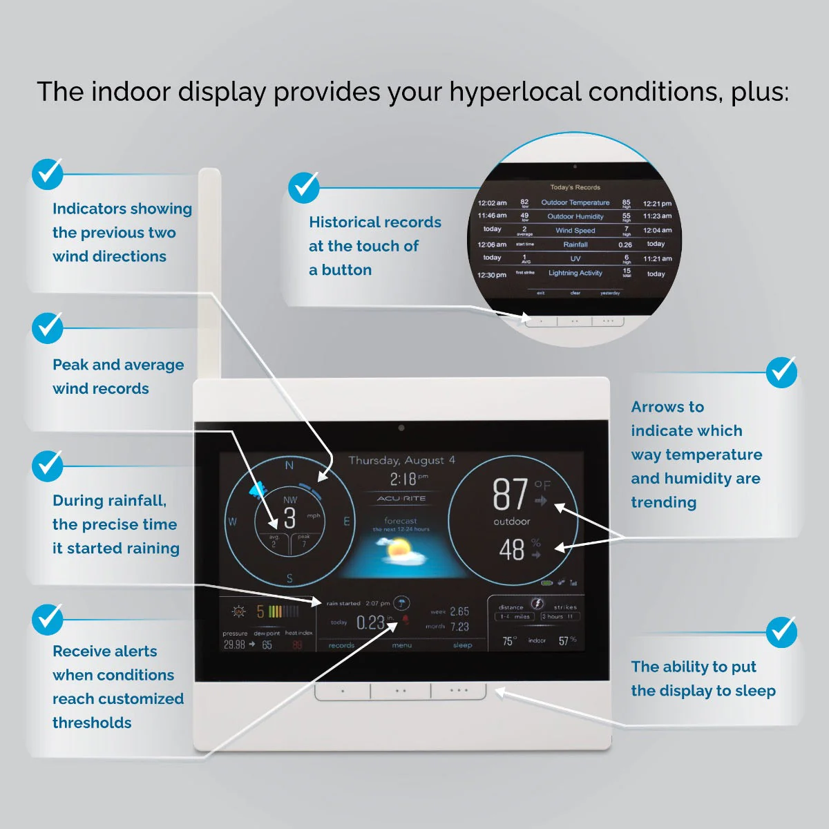 - Hyperlocal Weather Conditions: When used with an AcuRite Atlas, track temperature, humidity, wind speed, wind direction, rainfall, and UV index