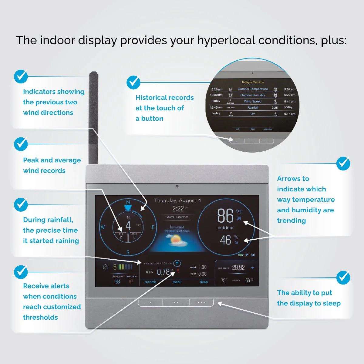 - Hyperlocal Weather Conditions: When used with an AcuRite Atlas, track temperature, humidity, wind speed, wind direction, rainfall, and UV index