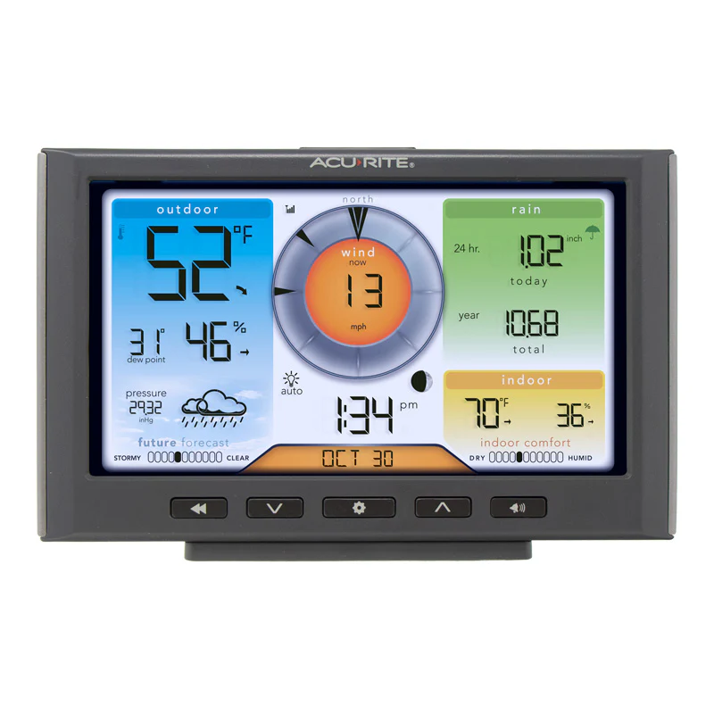 - Illuminated Color weather station display with backlight and auto dim for easy viewing