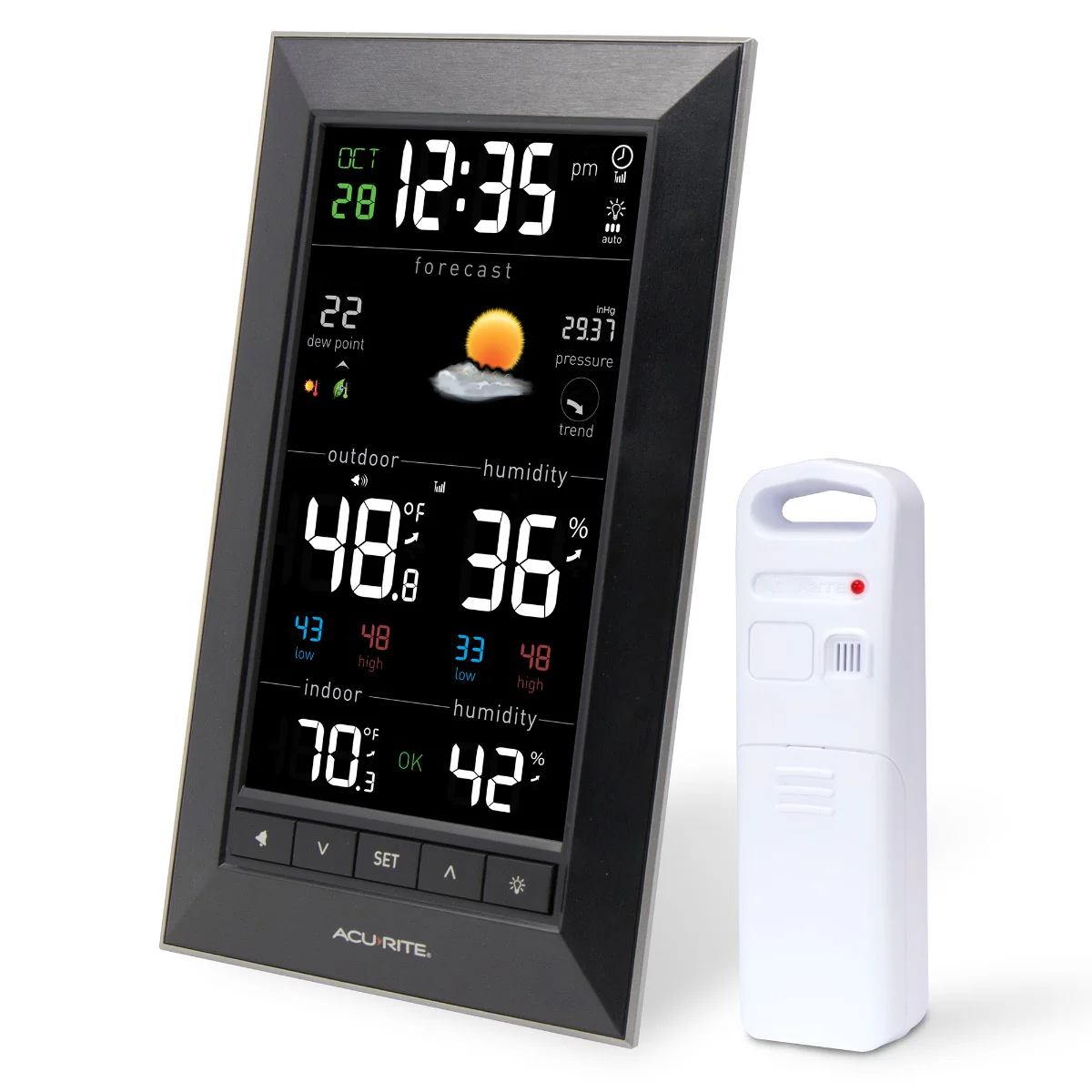 Not sure if you should be wearing a sweatshirt or shorts? With the AcuRite Color Weather Station, you will always know the outdoor conditions right outside your door with out having to step outside or turn on the news.