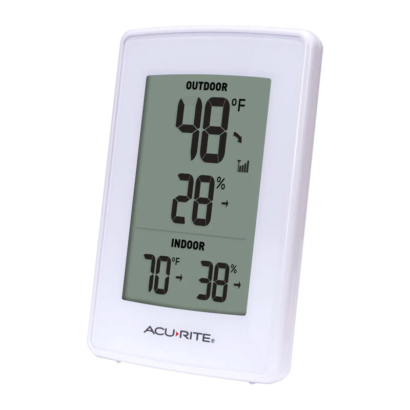The weather can have a major impact on your activities throughout the day. Staying informed of essential environmental conditions, such as temperature and humidity, can help you plan your day with confidence. The AcuRite White Digital Thermometer with Indoor/Outdoor Temperature and Humidity shows indoor and outdoor temperature and humidity information at a glance. The digital thermometer is easy to read and its compact size makes it convenient to place on any counter, shelf, or wall of your choice, making it easy to incorporate into your daily routine.